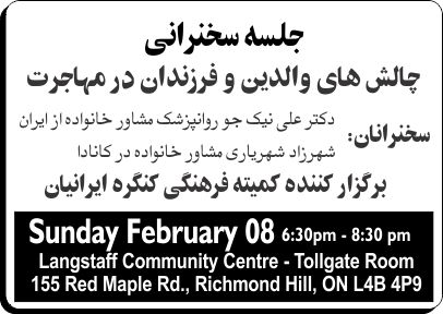 بیژن احمدی، فرزاد عیوق، سوده قاسمی و کاووس صوفی چند تن از اعضاء کمپین "من هم یک ایرانی-کانادائی هستم" که هدف آن افزایش تعداد اعضاء کنگره به هزار نفر تا پایان ماه مارچ میباشد، از دیگر شرکت کنندگان در این جلسه بودند. آنها مشکل اصلی کنگره را کمبود اعضاء و عدم مشارکت جمعی دانسته که از طریق این کمپین با موفقیت قابل توجه ای مشغول به عضو گیری برای کنگره میباشند. این گروه دومین گردهمائی ماهانه خود را، اینبار در رستوران لیلی که در آن بیش از صد و بیست نفر شرکت داشتند برقرار کرد. هدف از این گردهمائی ها آشنائی اعضاء جدید با یکدیگر میباشد. شرکت افراد سرشناس کامیونیتی و تعدادی از اعضاء هییت مدیره کنگره در این گردهمائی ها، تائیدی بر این حرکت خود جوش میباشد که هر بار بر وسعت و کیفیت آن افزوده میگردد. رامین جهانبگلو با حضور خود در این گردهمائی و ایراد سخنرانی کوتاهی که بیش از چند دقیقه طول نکشید، به بسیاری از موارد، از جمله دوستی و همدلی جهت انجام کار های مدنی، تنوع که میتواند باعث تحرک وتغییر مفاهیم گردد، اعتماد اجتماعی، خلوص نیت و مشارکت مدنی، که میتوانند در به حرکت در آوردن کنگره کمک نمایند اشاره میکند. علی احساسی، مایکل پارسا، سعید ضیائی، مهرداد آرین نژاد، احمد تبریزی، مجید جوهری، فرح طاهری، محمد تاجدولتی، مشهود ناصری، محسن تقوی، اسد زرین مهر، مهرداد حریری، منوهر میثاقی، نیاز سلیمی، شعله و مهرداد دولت آبادی، بهروز آموزگار، رضا قاضی، فرهنگ فرید، به اضافه آنهائی که نامشان به خطا از قلم افتاده است، با حضور خود باعث تشویق و دلگرمی این تیم جوان میباشند. اعضاء فعال این کمپین که هر روز بر تعدادشان افزوده میگردد قصد آن دارند که گردهمائی سوم خود را در محیطی وسیعتر و با شرکت هر چه بیشتر افراد کامیونیتی برگزار کنند. آنرا به مجمع عمومی تبدیل کرده که حضور هر فرد همچو رای تائیدی بر این حرکت، اظهار تمایل به نیرومند ساختن کنگره، مشارکت جمعی و ایجاد همبستگی و اتحاد هر چه بیشتر و منسجم تر در کامیونیتی باشد.فرصت را غنیمت شمرده و از کلیه افراد دعوت میشود که به این حرکتی که برای اولین بار در کامیونیتی صورت میگیرد پیوسته و در موفقیت هر چه بیشتر آن همکاری شود. کمیته فرهنگی کنگره ایرانیان نیز به سرپرستی شهلا غفوری، دومین گردهمائی عمومی خود را در تاریخ یکشنبه هشت فوریه، ساعت 6:30 بعد از ظهر در مرکز فرهنگی لنگ استاف واقع در شماره 155 خیابان رد میپل در ریچموندهیل برقرار خواهد کرد. در این گردهمائی شهرزاد شهریاری و دکتر علی نیکجو در رابطه با چالش های والدین و فرزندان در مهاجرت سخنرانی کرده و به سئوالات مدعوین پاسخ خواهند داد. حضور در این مجلس برای همگان آزاد و به صورت رایگان خواهد بود. در ضمن این جلسه فرصت مناسبی میباشد که به عضویت کنگره در آمده و بصورت داوطلب در فعالیت های کنگره شرکت نمود.
