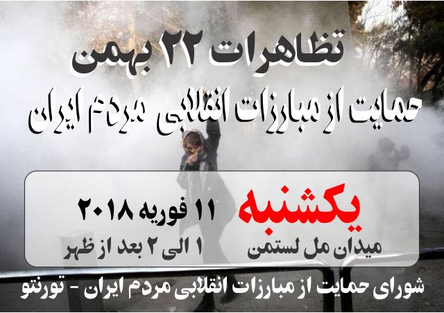 شورای حمایت از مبارزات انقلابی مردم ایران تظاهراتی را در روز یکشنبه یازدهم فوریه ساعت یک بعد از ظهر در میدان مل لستمن تدارک دیده است. با شرکت در این تظاهرات همچنان در حمایت از مبارزات بر حق مردم ایران همقدم و همصدا باقی بمانیم.