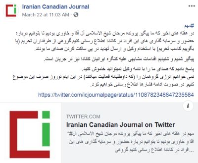 انگاری بهار امسال آنچه را که به عنوان یکی از راه حل های اساسی ولی نادیده گرفته شده میدانستیم، و سالها در باره اش سخن ها گفته ایم را با خود به ارمغان آورده است. مهاجرین دهه اخیر تغییراتی را در کامیونیتی بوجود آورده اند که برخی از آن فرهنگی، و نشئات گرفته از محیطی میباشد که در آن پرورش یافته اند، و بخش دیگر در رابطه با نحوه نگرش آنها نسبت به جمهوری اسلامی است. از هر دو نظر، این افراد نسبت به مهاجرین دوره های اول که کمتر با جنبه های مخرب فرهنگ جمهوری اسلامی در تماس بوده، مدت طولانی تری در جامعه آزاد و دموکراتیک کانادا حضور داشته، و از مخالفین سرسخت تری با رژیم اند، فرق های اساسی دارند. تفرقه و رودرروئی هائی که اخیرن شاهد آن بوده و به مرور زمان بر شدت آن افزوده میشود، میبایست تا به حال ما را متقاعد کرده باشند، که در خودگردانی، احترام به حقوق یکدیگر، و احساس تعلق به جمع ناتوان هستیم. بدون مرجعی با قدرت اجرائی که تعیین کننده حقوق، حدود و قصور باشد، اگر به این گونه ادامه دهیم محیطی را خواهیم ساخت که چه بسا در مقایسه با آنجه در ایران میگذرد به مراتب مخرب و مسموم تر باشد. غافل از آنکه در جامعه ای زندگی میکنیم که بر مبنای قانون بنا شده و در بی طرفی و عدالت آن جای شکی نیست. طبق اظهارات کنگره ایرانیان (آی سی سی) و آی سی جی (آی سی ژورنال) که در اصل یک نهاد در دو نقش میباشند، اقدامات قانونی بصورت مجزا علیه هر دوی آنها از طرف افرادی که هنوز رسمن معرفی نشده اند صورت گرفته است. هییت مدیره کنگره، در نیمه شب شنبه، ایمیلی برای اعضای خود ارسال و اعلام میدارد که در تاریخ 21 مارچ نامه ای از طرف وکیل چهار عضو این نهاد دریافت کرده، که اقدامات قانونی را برای دریافت اسامی اعضای این نهاد آغاز کرده اند. اولین جلسه دادگاه نیز سه شنبه همین هفته برگزار گردید که تا این لحظه اطلاعاتی از آن منتشر نشده است. در ضمن از طریق همین نامه هییت مدیره آمادگی خود را جهت پاسخگوئی به سئوالات اعلام کرده است که متاسفانه تا این تاریخ به سئوالات مطرحه اینجانب پاسخی داده نشده است. دراین نامه متذکر شده ام که در سه سال اخیر هییت مدیره ها حتی از اعلام اسامی داوطلبینی که با این نهاد همکاری میکنند خودداری کرده است. مشخص هم نیست که تا به حال لیست نام اعضاء را که چنین حساسیتی به آن نشان میدهد، در اختیار چه کسانی قرار داده، چگونه از آنها استفاده و نگاهداری شده است. از اینرو خواهان معرفی افرادی شده ام که تا به حال، اطلاعات اعضای کنونی، گذشته و هواداران را که به گفته هییت مدیره حدود ده هزار نفر میباشند را در اختیار داشته اند. بعد از تخلفات در انتخابات گذشته جای تعجبی نیست که عده ای، بخصوص چهار کاندیدای انصرافی، بخواهند که از حقوق تعیین شده خود در قوانین سازمان های غیر انتفاعی انتاریو بهره گرفته و بدانند که چه کسانی و از چه مناطقی در این نهاد عضویت و حق رای داشته اند. بخصوص زمانی که بعضی از اعضای هییت مدیره با بوجود آوردن نهاد بی هویت آی سی جی، به تخریب فعالان اجتماعی و سیاسی پرداخته اند. خوشبختانه این نهاد نیز بعد از ده ماه پنهان کاری مجبور شد که دست اندرکاران خود را که مهره های اصلی آن، بیژن احمدی و محسن خانیکی، دو تن از اعضای فعلی هییت مدیره میباشند را معرفی کند. آی سی جی اعلام کرده است که شهرام تابع محمدی یکی از فعالان اجتماعی و علاقمندان کنگره ایرانیان که در چند سال اخیر بیشترین فعالیت ها را برای بهبود وضعیت این نهاد انجام داده است، از طریق وکیل نامه ای به آنها ارسال داشته است.