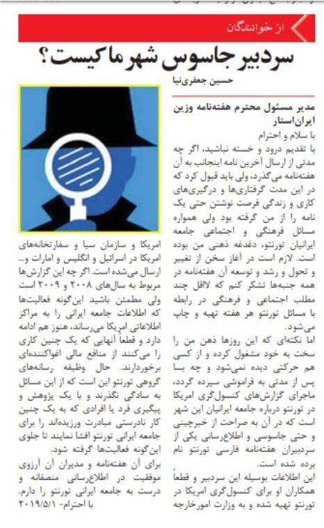 هیچکدام از نشریات ما اشاره ای به این مطلب نمیکنند، تا اینکه در اوائل ماه می یکی از نشریات، در بخش نامه خوانندگان، تحت عنوان "سردبیر جاسوس شهر ما کیست؟" از زبان خوانندگان به این موضوع میپردازد.(عکس در پائین همین صفحه) هفته گذشته در همان نشریه و در بخش پاسخ به خوانندگان پیشنهاداتی عنوان میگردند که نشریات با کمک "یکدیگر" سردبیر به اصطلاح "جاسوس" را شناسایی کرده و به جامعه معرفی نمایند. این موضوع را به خاطر خود مطلب مطرح نمیکنم. بلکه منظور من نحوه عمل این نشریه است که به صراحت رسیدگی و بررسی رفتار همکار خود را از وظایف رسانه ای دانسته و چنین عملی را تائید میکند. جالب توجه آنکه به گونه ای سخن میگوید که نشریه خود را مبرا از هر خطا دانسته و سردبیران نشریات دیگر را هدف قرار میدهد. گزارش ویکی لیکس به سال 2009 مربوط میگردد. شهروند، شهرما، سلام تورنتو و ایران استار تنها نشریاتی میباشند که به موضوعات اجتماعی-سیاسی توجه داشته و در آنزمان فعال بوده اند. نگارنده "پاسخ به خوانندگان" که نام خود را ذکر نمیکند، عملن سه سردبیر شناخته شده سه نشریه دیگر را در جایگاه متهمین قرار میدهد. نشریه خود را "تنها نشریه ایرانی تورنتو که چه در نشریه و چه در فضای اینترنتی به دیدگاه همه نوع ایرانیان کانادایی میپردازد" معرفی میکند. اینگونه برخورد ها را چه میتوان نامید و چه نتایجی خواهند داشت؟ آیا هیچکدام از نشریات ما، بخصوص این نشریه در رابطه با موضوعات دیگر نیز "پیگیر" و به همین اندازه حساس و کنجکاو میباشند؟ آیا در رابطه با کنگره ایرانیان مطلبی در این نشریه منتشر میشود؟ یا اینکه دوری از هر موضوعی که باعث بوجود آمدن تفرقه در جامعه شود، توجیه و بهانه مناسبی برای گریز از وظیفه رسانه ای میگردد؟ تعداد افراد مستقل که در رابطه با موضوعات و مشکلات کامیونیتی به صورت مستمر و داوطلبانه مینویسند، در کلیه نشریاتی که به امور اجتماعی-سیاسی میپردازند، از تعداد انگشتان یک دست فراتر نمیرود. در درجه اول لازم است که خود این افراد به اهمیت نقشی که در فرهنگ سازی به عهده دارند پی ببرند. با هر نشریه ای که همکاری دارند سعی کنند خط قرمز ها و محدودیت هایی را که نشریات برای آنها تعیین میکنند جا به جا نمایند. به اموری بپردازند که پرداختن به آنها برای مسئولین نشریات مشکل زا میباشد و مانع آن گردند که معذورات اخلاقی یکی باعث جسارت دیگری گردد. نشریات ما نیاز به توجه و حمایت دارند، همانطور که با توجه و حمایت از کنگره ایرانیان باعث شدیم که تعداد بیشتری از افراد با مهمترین نهاد کامیونیتی آشنائی پیدا کنند. با وجود همه تلاش ها برای در مسیر صحیح قرار دادن این نهاد، بحران و تفرقه ای که در سه سال اخیر بوجود آورده است، نشان از قدرت ماهییتی آن در تاثیر گذاری در کامیونیتی و جامعه بزرگتر است. بیشک اگر این نهاد فعالیت های خود را بر نکات مشترک و خواسته اعضاء و نه هییت مدیره متمرکز میکرد، تغییر و تحولی را بوجود میاورد که باعث شگفتی همه ما باشد. به همین طریق، باشد که با توجه بیشتر به رسانه ها، تغییر و تحولی در آنها بوجود آوریم که در درجه اول، خوانندگان جایگاه اصلی را در آنها پیدا کنند. امور مربوط به کامیونیتی در صدر قرار گیرند. رقابت نه در کسب آگهی های بیشتر، بلکه برای بالابردن سطح آگاهی جمعی، آشنائی با مسئولیت های مدنی و شهروندی، فرهنگ سازی، تاثیر گذاری و یافتن جایگاه در بخش های اقتصادی، سیاسی و فرهنگی جامعه بزرگتر گردد. با به خاطر داشتن اینکه کنگره ایرانیان و رسانه ها دو رکن اصلی کامیونیتی میباشند، آنچنان عمل کنیم که بلائی که گریبانگیر کنگره شد در رسانه ها تکرار نگردد.