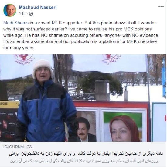 ایمیل مشهود ناصری به نشریه شهرما: سلام سردبیر محترم نشریه شهر ما، عکس فوق امروز توجه من را بخود جلب کرد. :در زیر عکس نوشته شده : شرکت مهدی شمس در تظاهرات سازمان مجاهدین خلق در تورنتو https://www.icjournal.ca/news/mehdi-shams-letter-ralph-goodale-iranian-students در گفتگو امروز با من آقای شمس به اصالت عکس اعتراضی نداشتند. این عکس برای من تازگی داشت، فکر کردم با شما هم در میان بگذارم شاید برای شما هم همینطور باشه. در اینصورت سوال من از شما این است از آنجایی که چندین سال است نشریه شما هر هفته سکویی برای نشر اغلب- اگر نه همیشه- اغراض پنهان سازمان وابسته به آن و ادعاهای بی پایه و دلیل ایشان است، آیا شما از وابستگی ایشان به مجاهدین خلق اطلاع داشتید؟ آیا برای شما مبارزه با رژیم ایران همکاری با عوامل این سازمان تروریستی و پلید که با صدام علیه ایران و ایرانی جنگیده و در زیر چتر حمایتهای خاندان خبیث و جنایتکار آل سعود قرار دارد، قابل توجیه است؟ با شناختی که از شما دارم حتما اینطور نیست. در غیر اینصورت تصور من این است که توضیحات لازم از طرف آن نشریه ضروری خواهد بود. با تشکر، مشهود ناصری ریچموندهیل